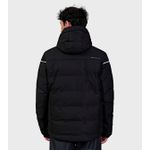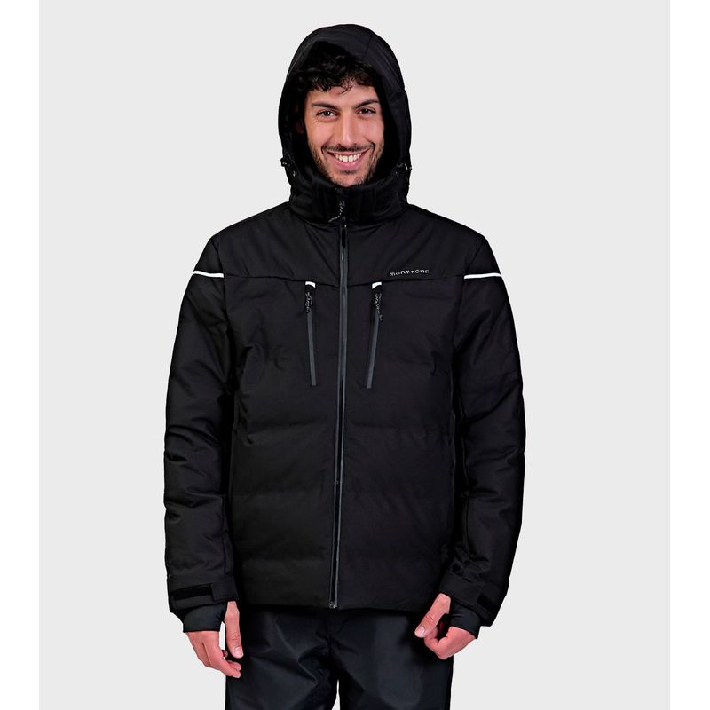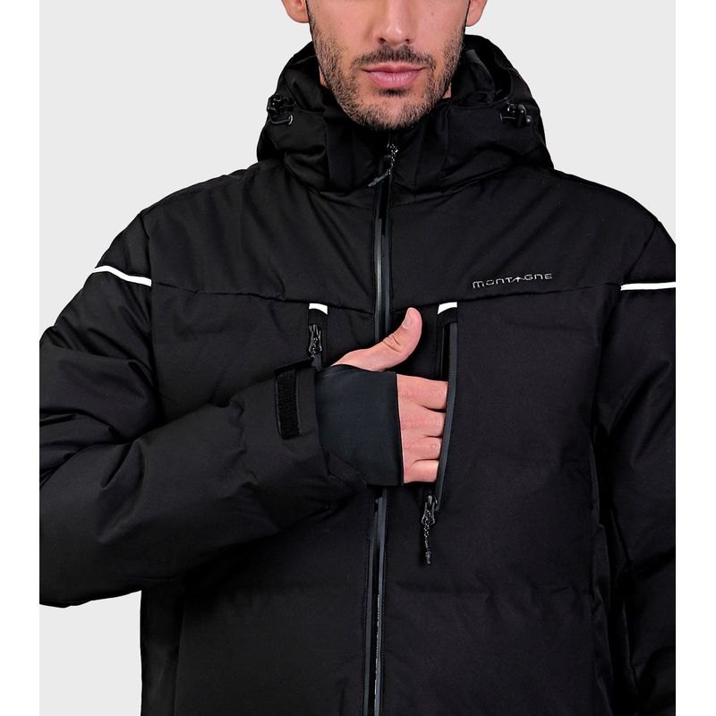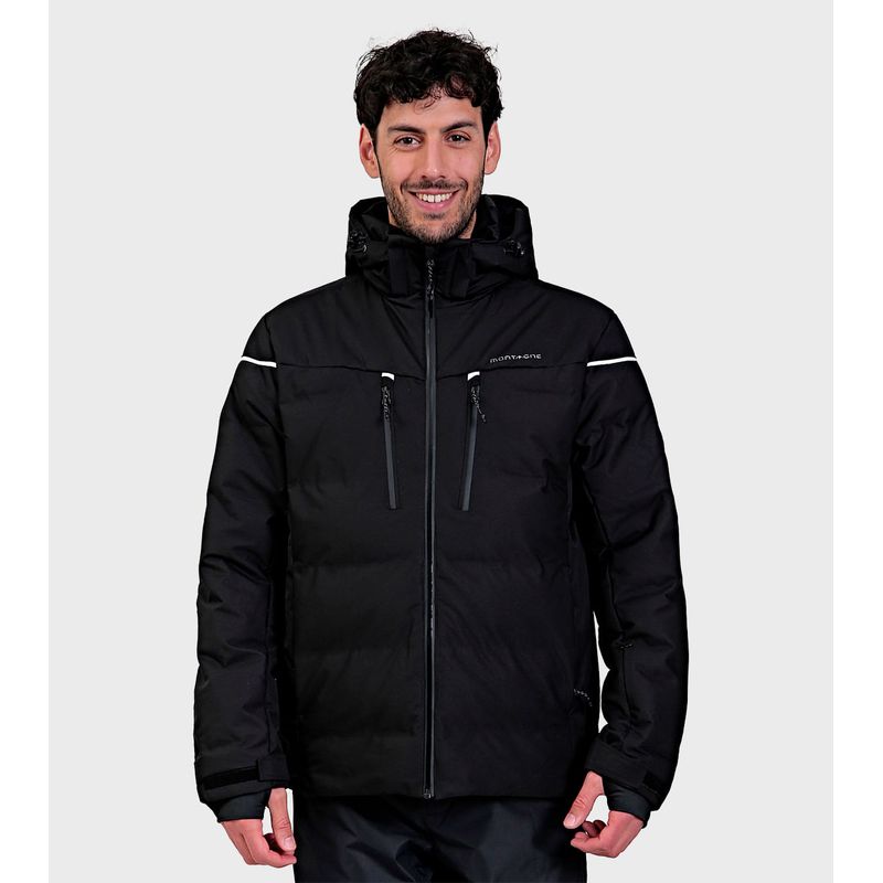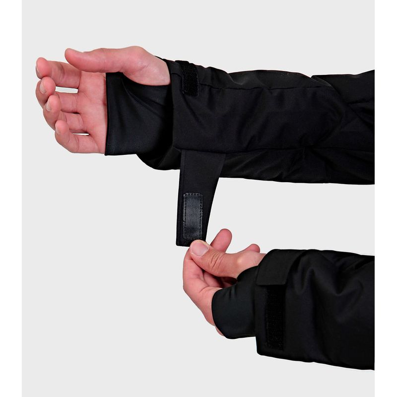 TELA EXTERIOR Y COMPOSICIÓN: Tejido bicapa con membrana impermeable/respirable y muy buena repelencia al agua. Exterior: Poliester 100% Membrana: Poliuretano 100% TELA INTERIOR: Tafeta Ciree 210T. 100% Poliester Tejido de punto 100% Poliester Mesh 100% Poliester RELLENO: Eco Down. Microfibra hueca de alta retención térmica. Ultraliviana. Poliéster 100% DESCRIPCIÓN: Capucha desmontable con regulación y 2 puntos de ajuste Bolsillos laterales con cierre Bolsillo portapase Bolsillos internos Trampa de nieve fija Guantín interno Cierres impermeables Puños con regulación por velcro