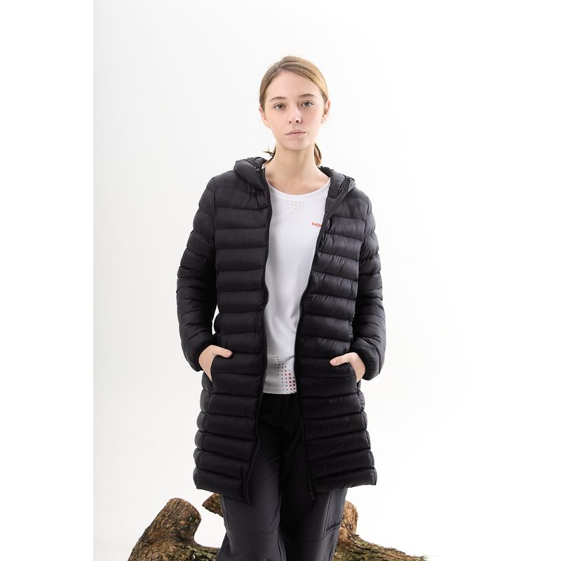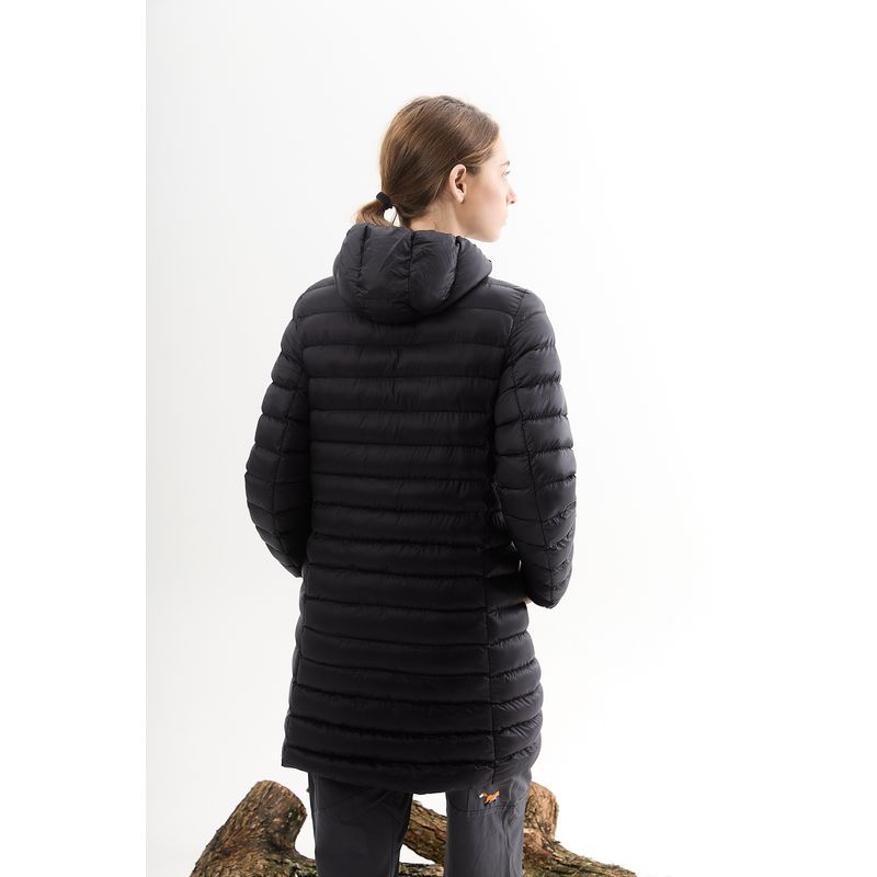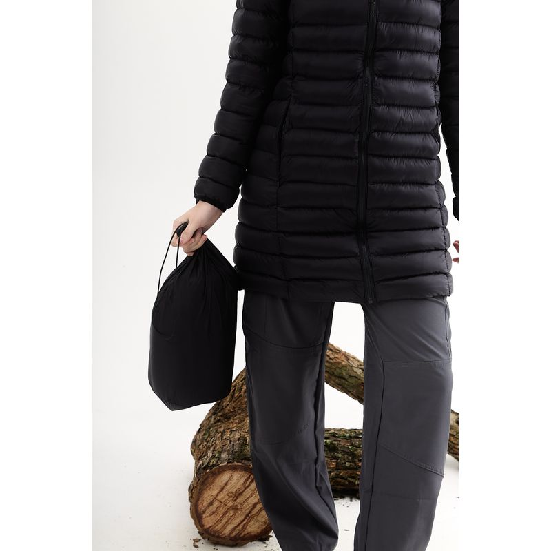Campera larga ultraliviana de nylon matelaseada con capucha + bolsa packaging de tela.