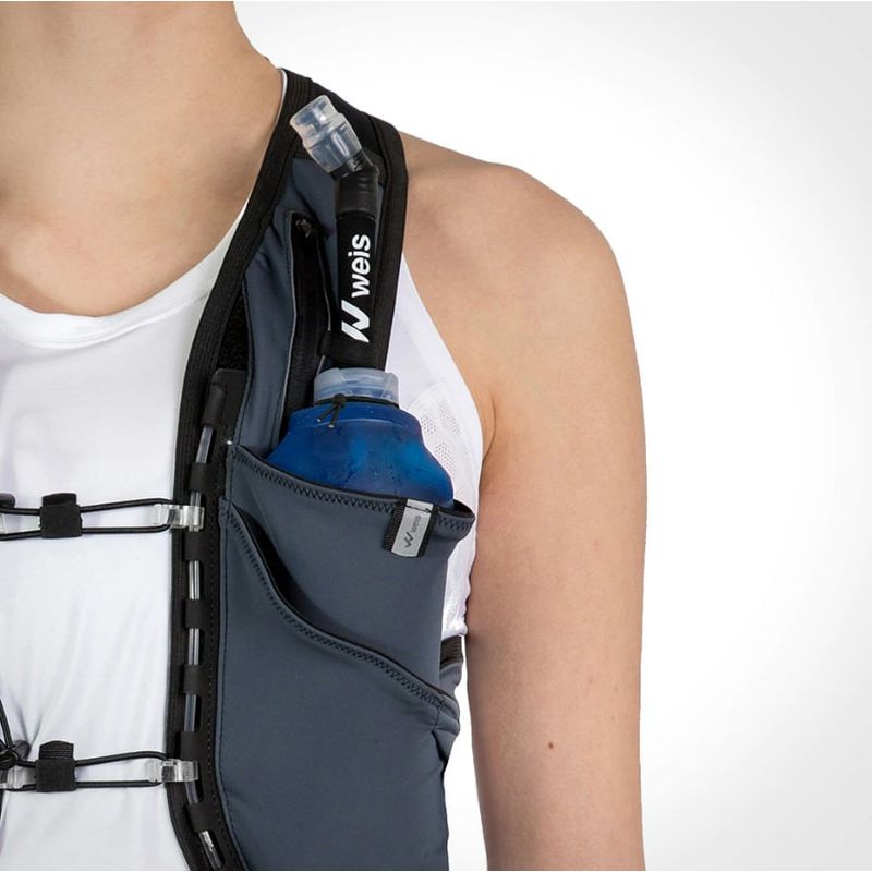 - 2 compartimentos frontales con hangers y portabombillas para botellas blandas tipo soft flask (recomendada), botellas rígidas ó caramañolas de hasta 750 ML.