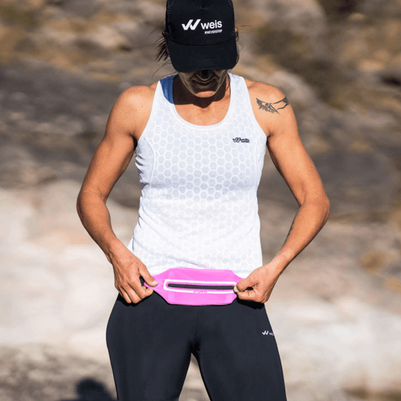 Vacía es ultradelgada, pero su bolsillo con cierre triplica su capacidad de almacenamiento y no se siente en el cuerpo. Además, gracias a la correa elástica se ajusta al cuerpo y reduce al máximo el rebote.